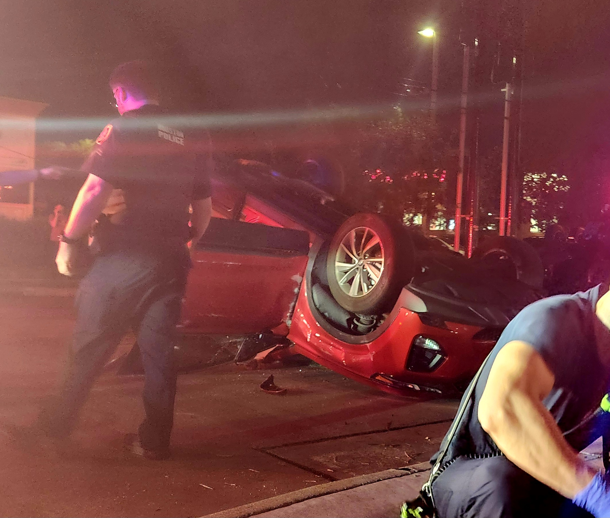 I looked up to see a fire truck coming right at me from the south. It stopped about 10 feet away with its headlights shining on us. A car honked as it tried to maneuver through the intersection. Someone chastised the driver. I didn’t care. Do what you want. We were all safe and alive. I focused on my breathing, wondering how my hand could hurt so much. It occurred to me that I could be going into shock. Does one recognize that in oneself? My car was upside down and I was in shock.
